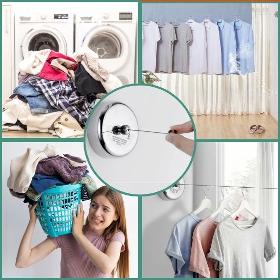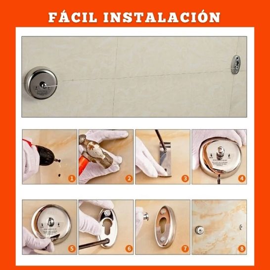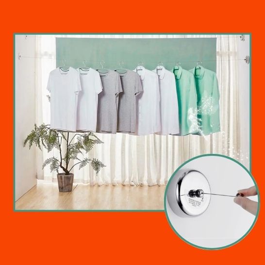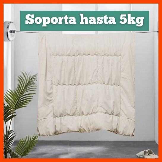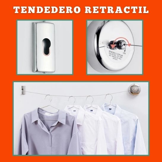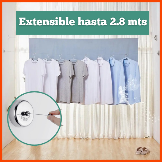 Tendedero retráctil de acero inoxidable 304. Se extiende hasta 2.8 m, soporta 5 kg y se retrae al instante.
